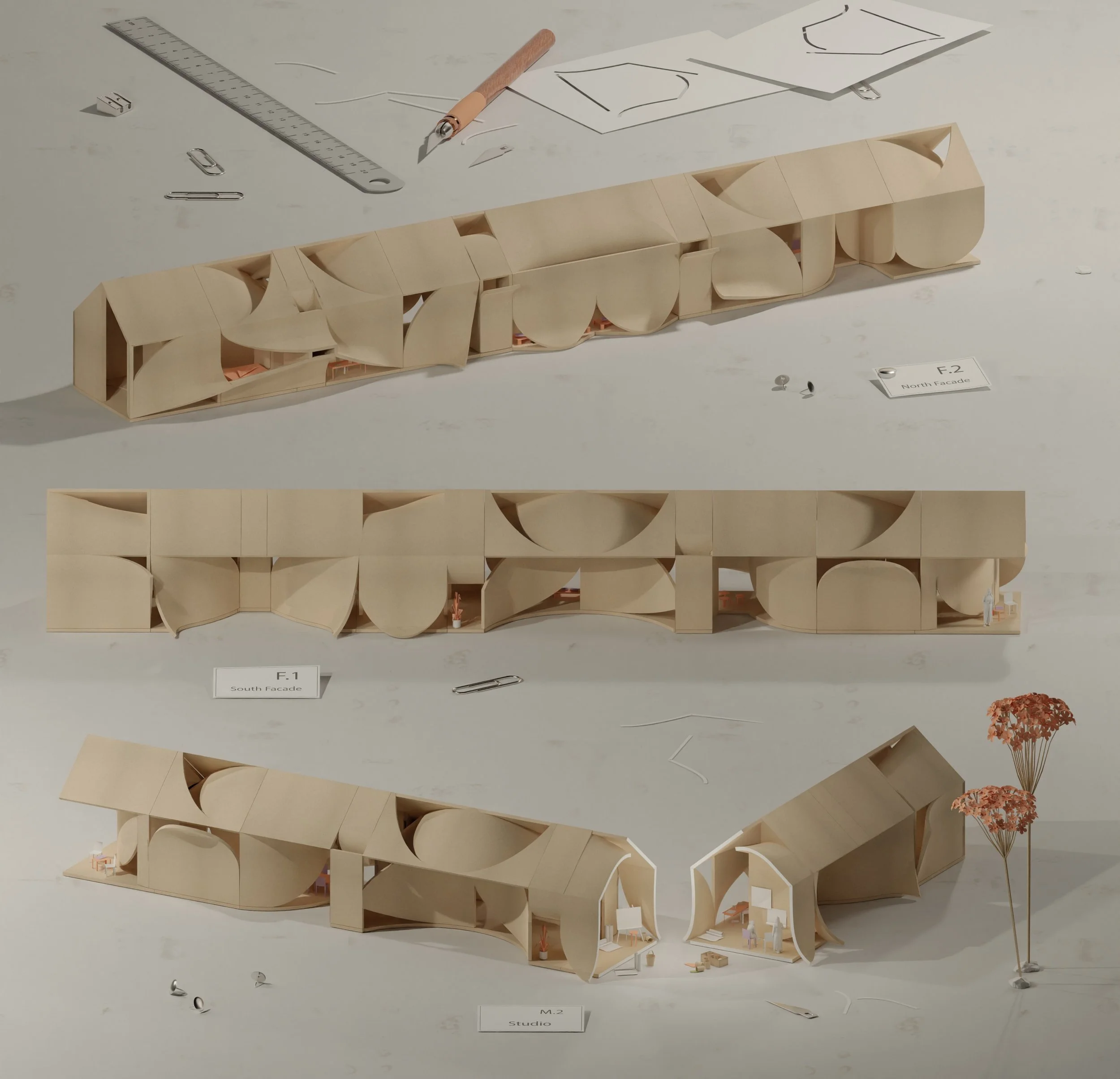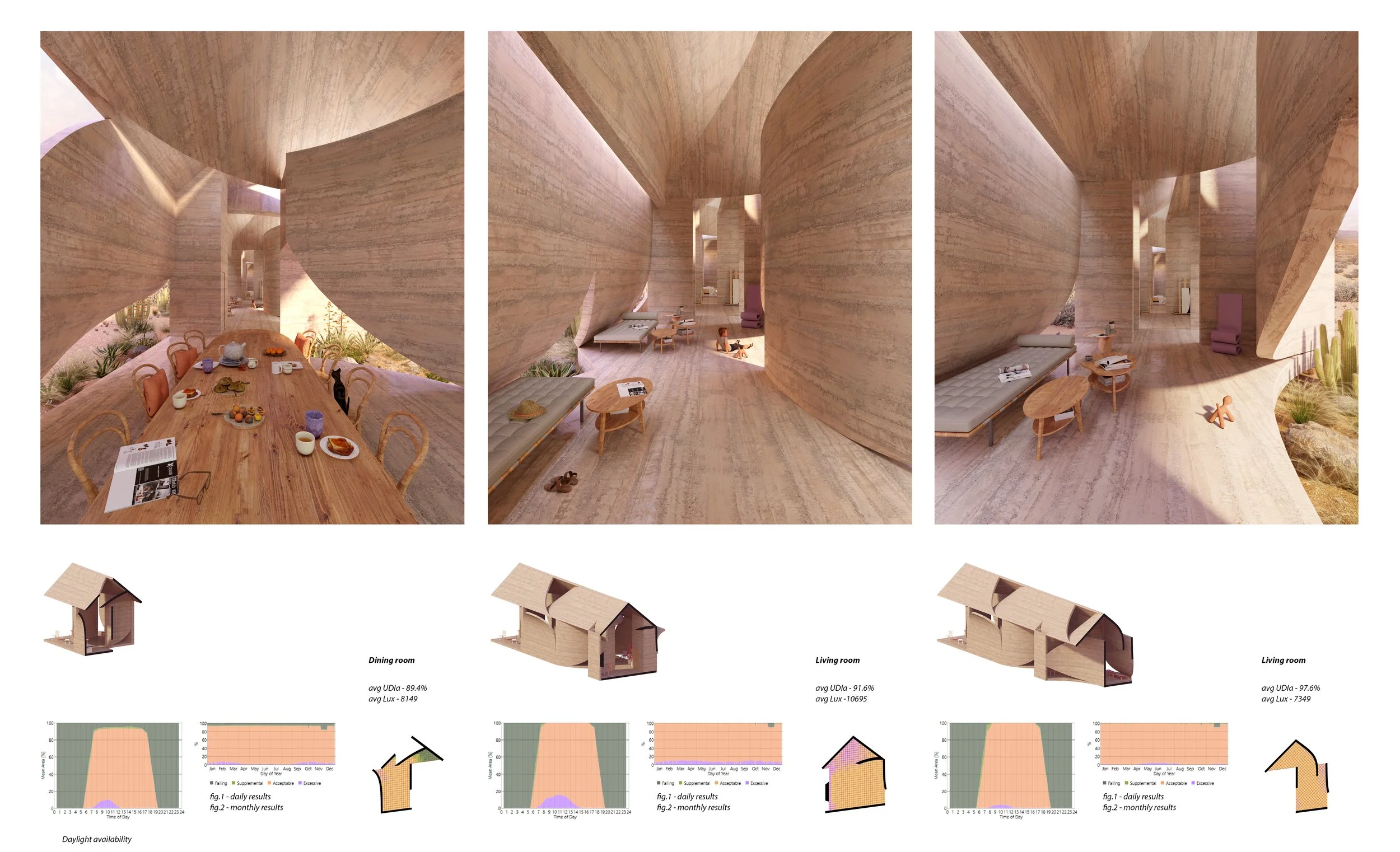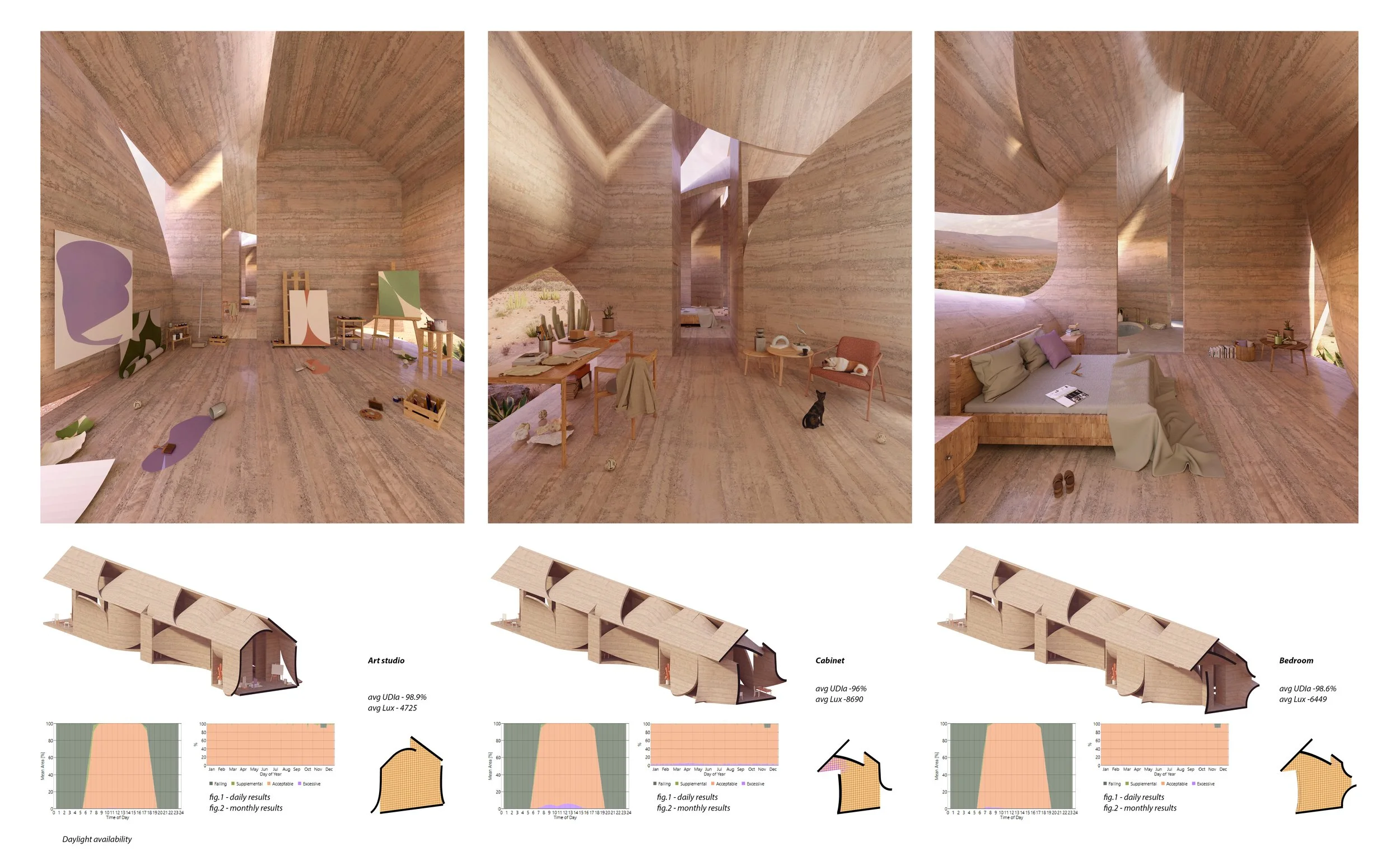 The south façade is designed to block intense direct sunlight while allowing light to reflect and diffuse across its surfaces. In contrast, the north façade incorporates a series of horizontal and vertical openings that frame views and introduce even, ambient illumination. Daylight simulations (Figs. 1–6) demonstrate the effectiveness of this strategy.