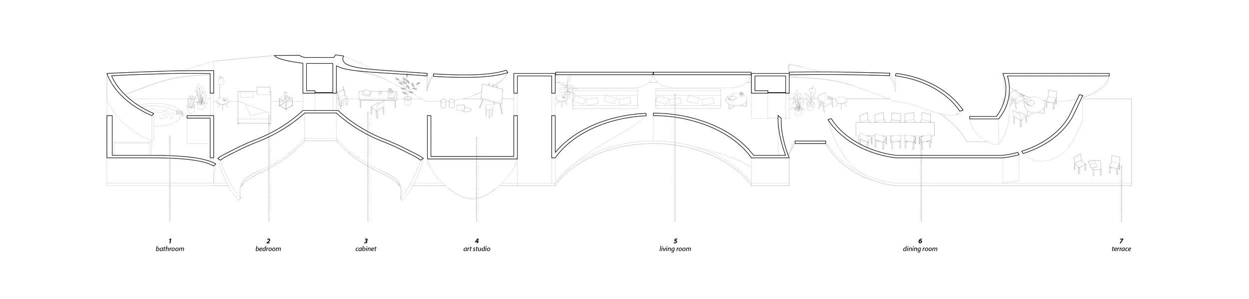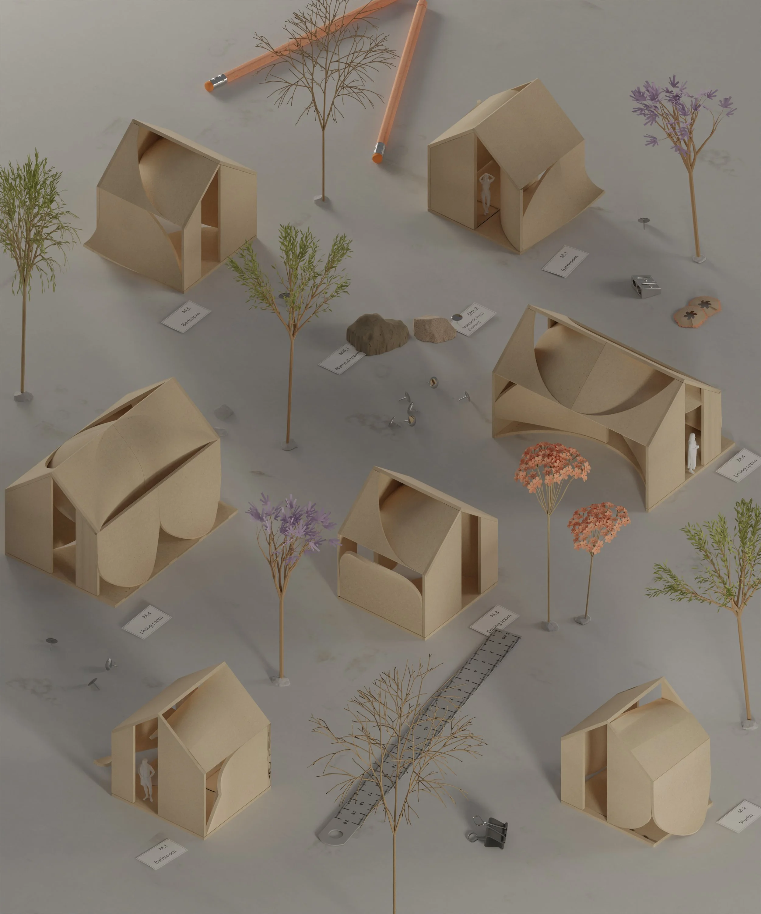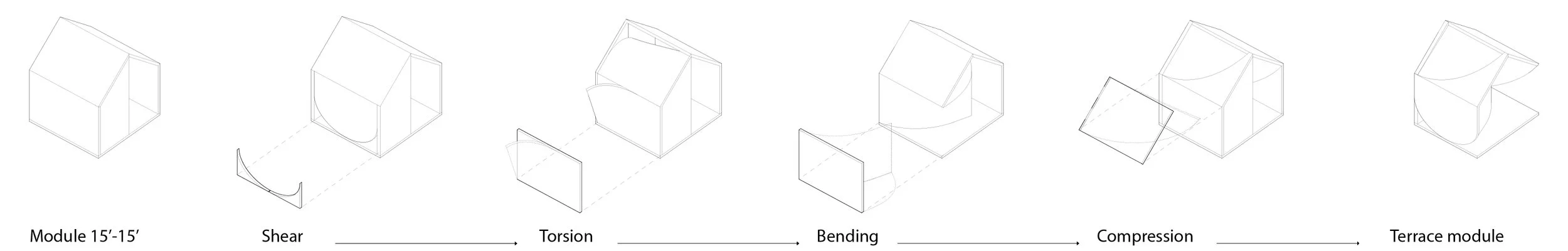 Targeted forces are applied to wall and roof elements to generate a range of solid transformations. These deformations are explored as a spatial design tool, reimagining rammed earth as a more malleable material.