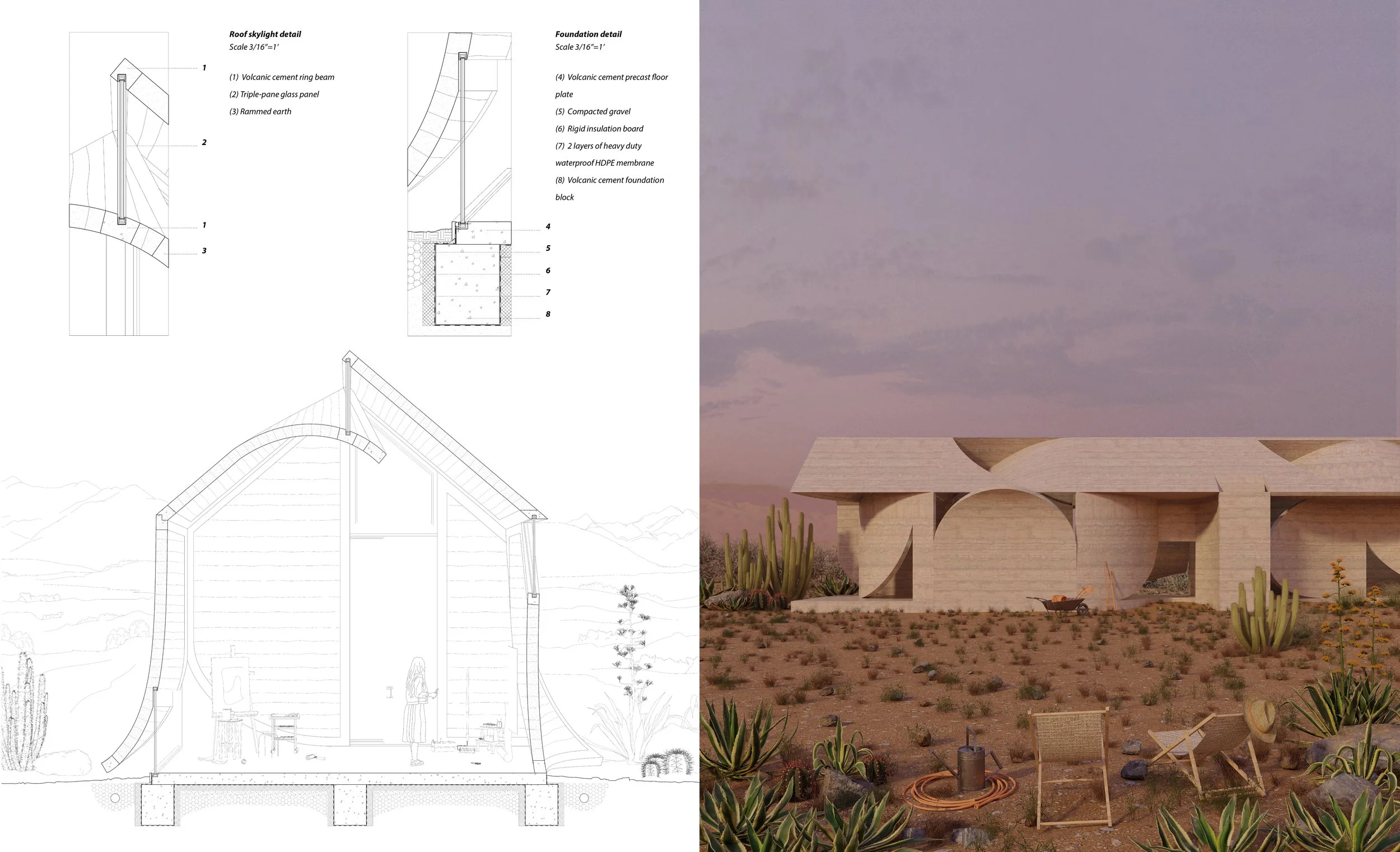 Materials: Rammed earth, volcanic cement