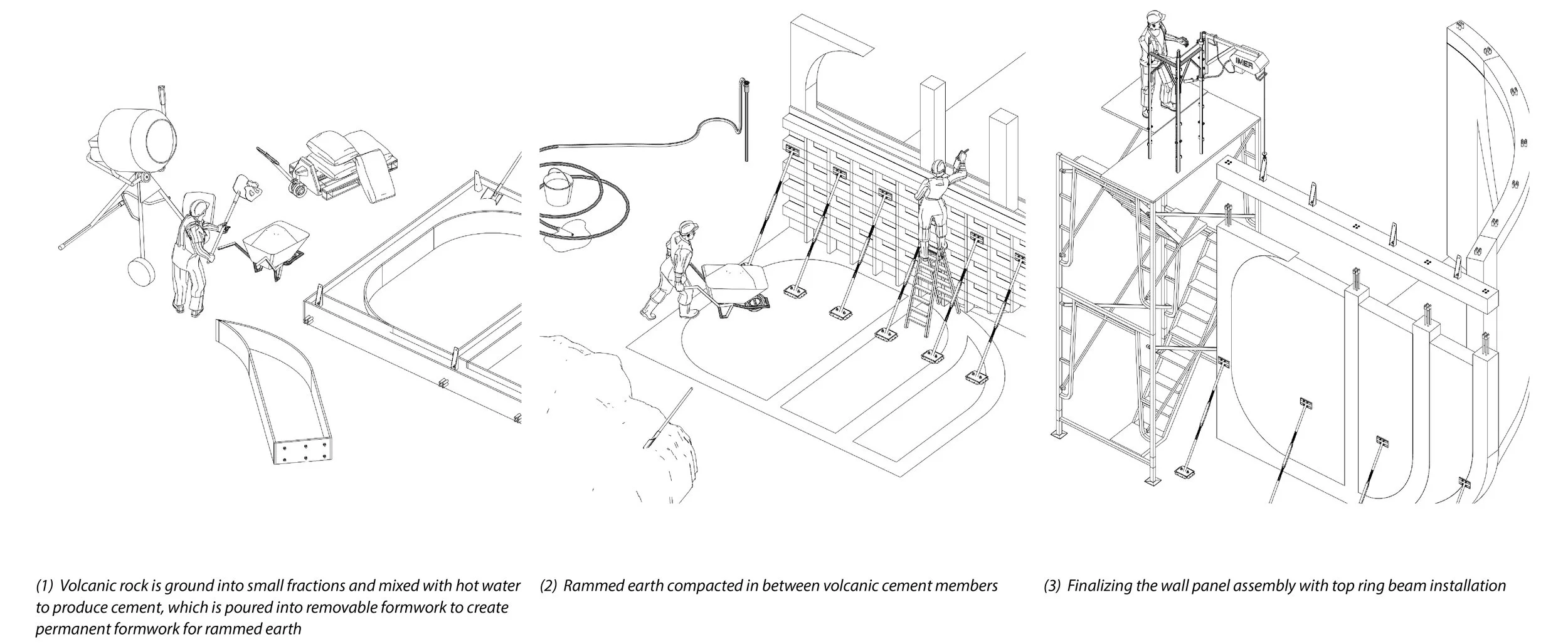 The project uses rammed earth as the primary construction material to reduce its carbon footprint. Natural loam is compacted between reinforced ring beams and vertical members. These vertical elements are made of volcanic cement with recycled plastic mesh reinforcement, providing structural integrity, flexibility, and strength.