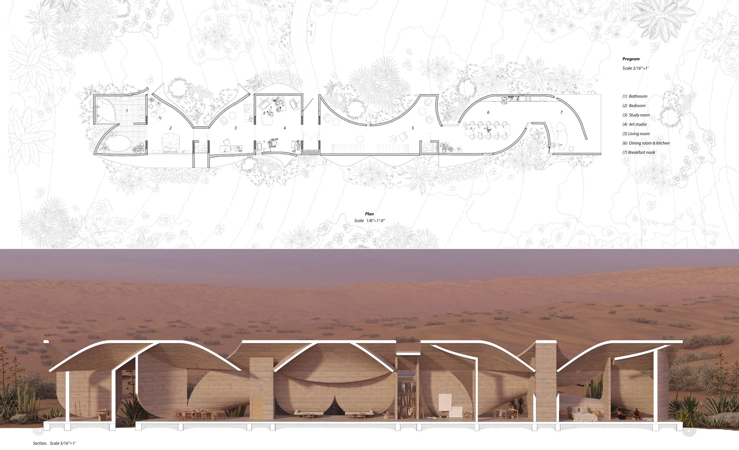 An artist’s house, located in the rural landscape of La Paz and surrounded by monumental mountain peaks, reconsiders the role of windows and skylights in shaping interior space. Using rammed earth as the primary material, the design explores a malleable approach to form, function, and light. The project investigates how rammed earth can be sculpted to produce expressive geometries, and how these forms can modulate and amplify daylight. Surfaces operate in continuous dialogue—solid and open, straight and curved—guiding how light enters, reflects, and moves through the space over the course of the day.