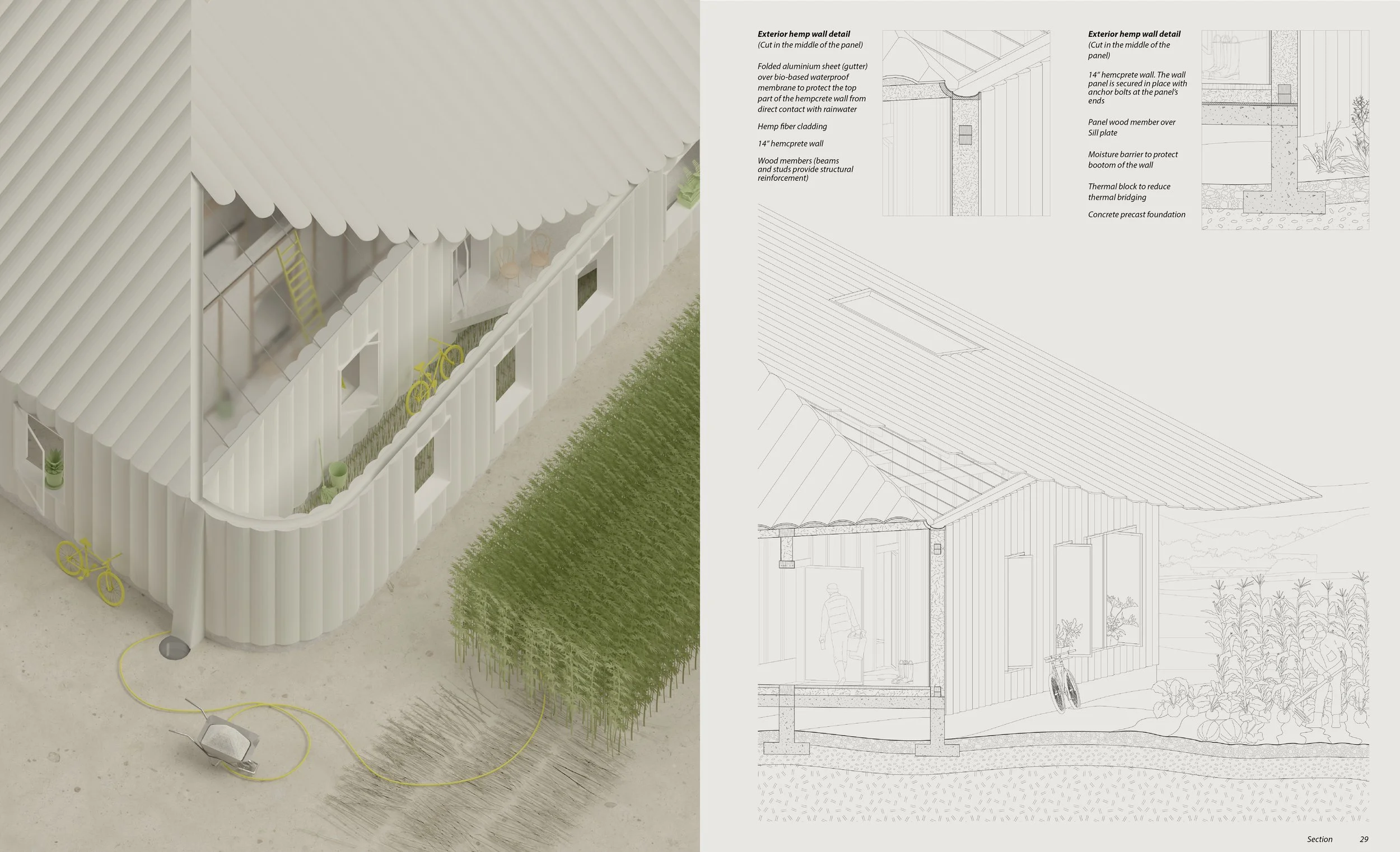 Addressing this challenge, this thesis investigates the potential of carbon-negative assemblies as a strategy for more sustainable built environments. It focuses on hempcrete, a carbon-sequestering material, proposing new models of rural domesticity. The research examines how such materials can inform conceptual design, construction methods, and assembly strategies.