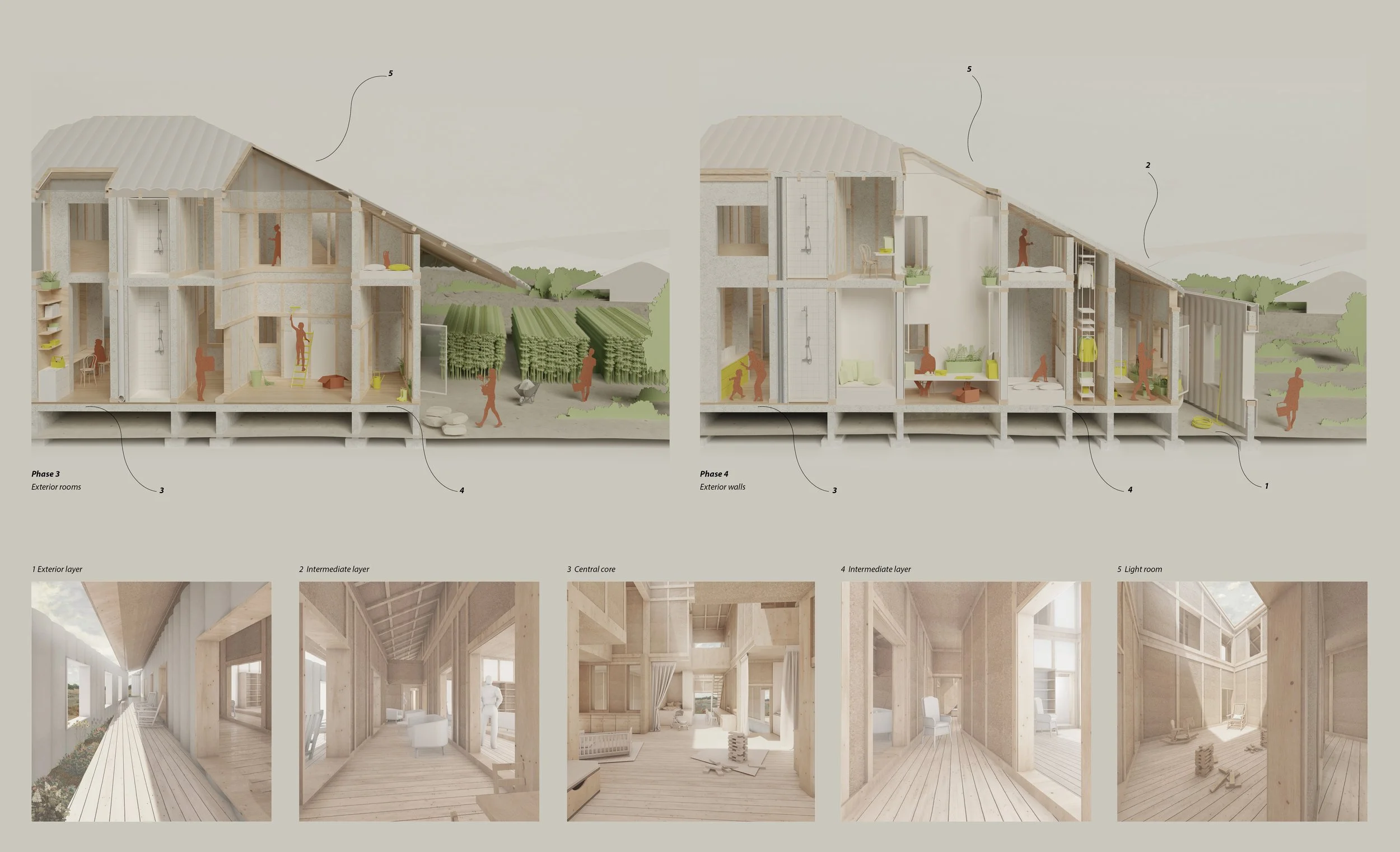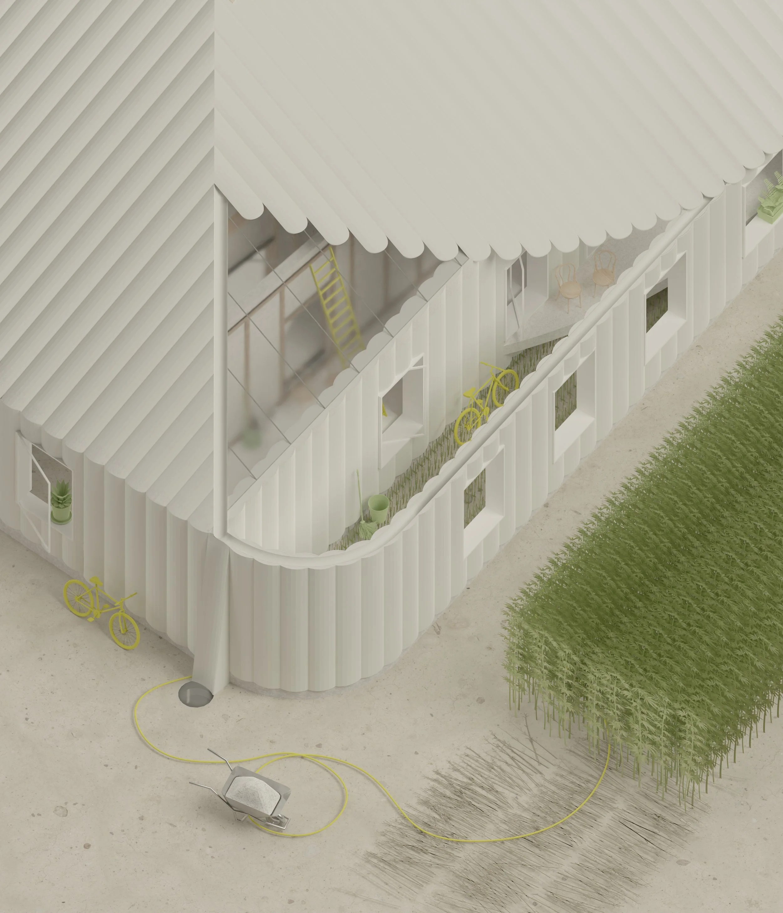One material, many roles. Hempcrete consolidates structure, insulation, and enclosure into a single, breathable mass. The house is not layered—it is thickened. It is not sealed—it breathes. ‘ Hempcrete Layers of domesticity’ emerge through gradients of temperature, light, and occupation. Construction and inhabitation become one continuous act. The house is never complete. It evolves with those who build and inhabit it.