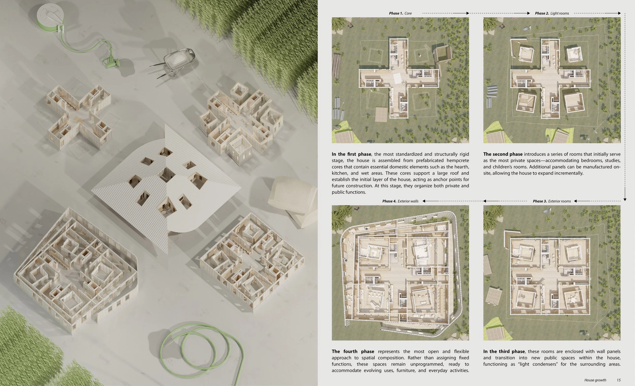 This project reimagines building as an evolving system, where the house grows, adapts, and reorganizes over time. Unlike fixed, institutional models, domestic space is understood as open-ended—shaped by use, climate, and change. Build in stages. Build as needed. The house begins with a core—hearth, kitchen, wet areas—a complete minimum dwelling. From this core, it grows.