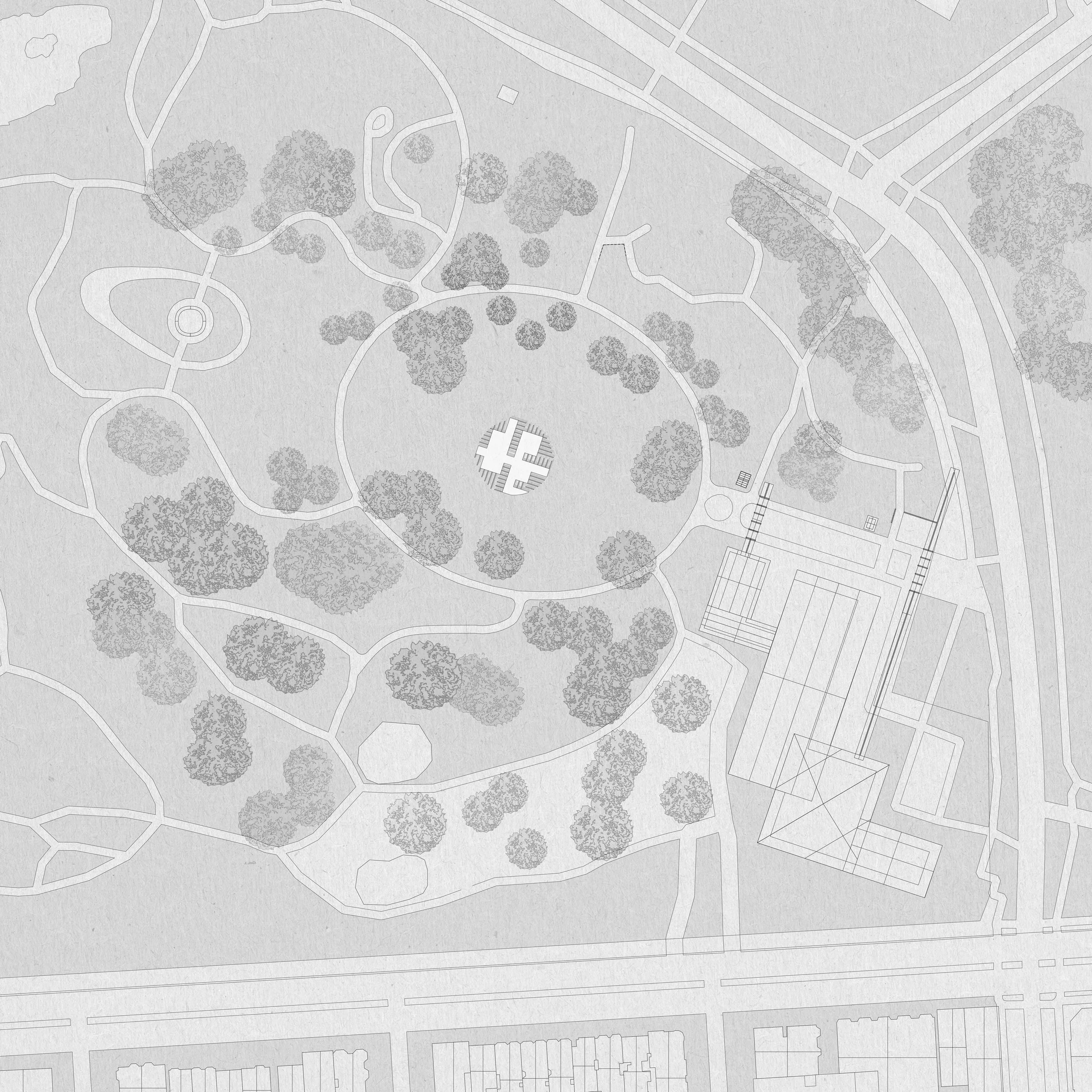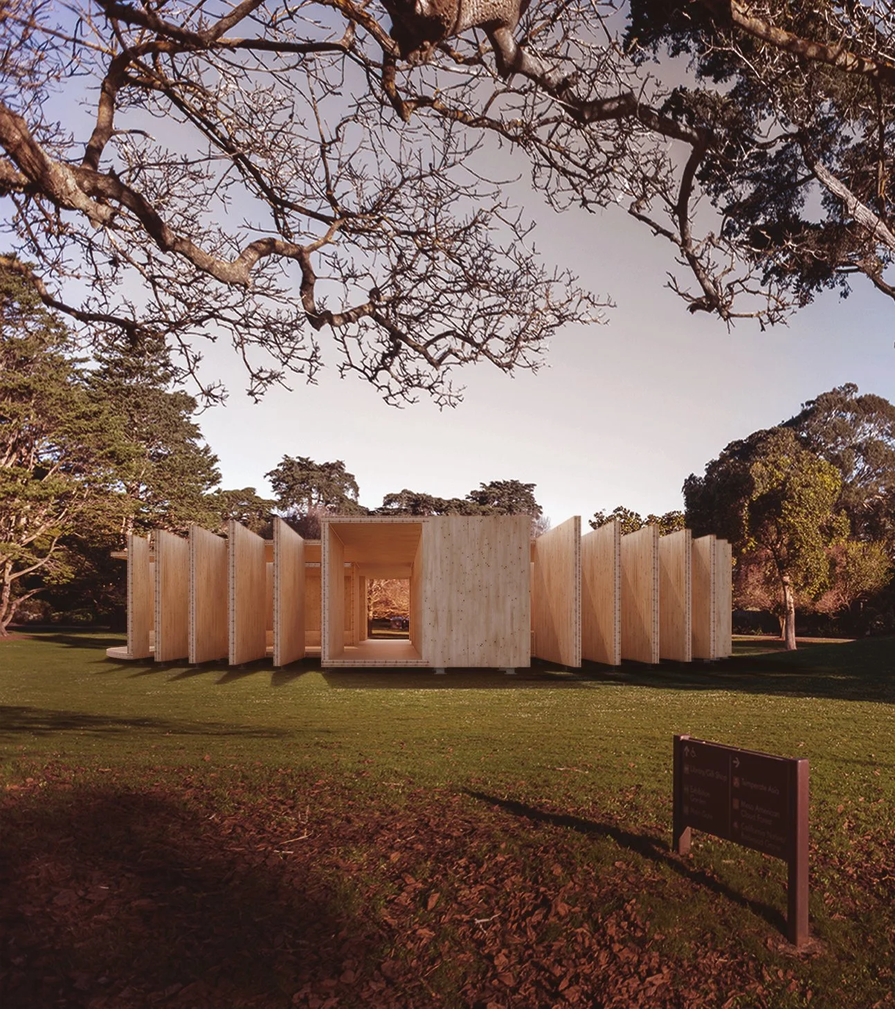 CLT panels form roof, wall, and floor within a single, continuous system. Set on steel knife-plate connections anchored to concrete blocks, the structure minimizes its footprint on the park.
