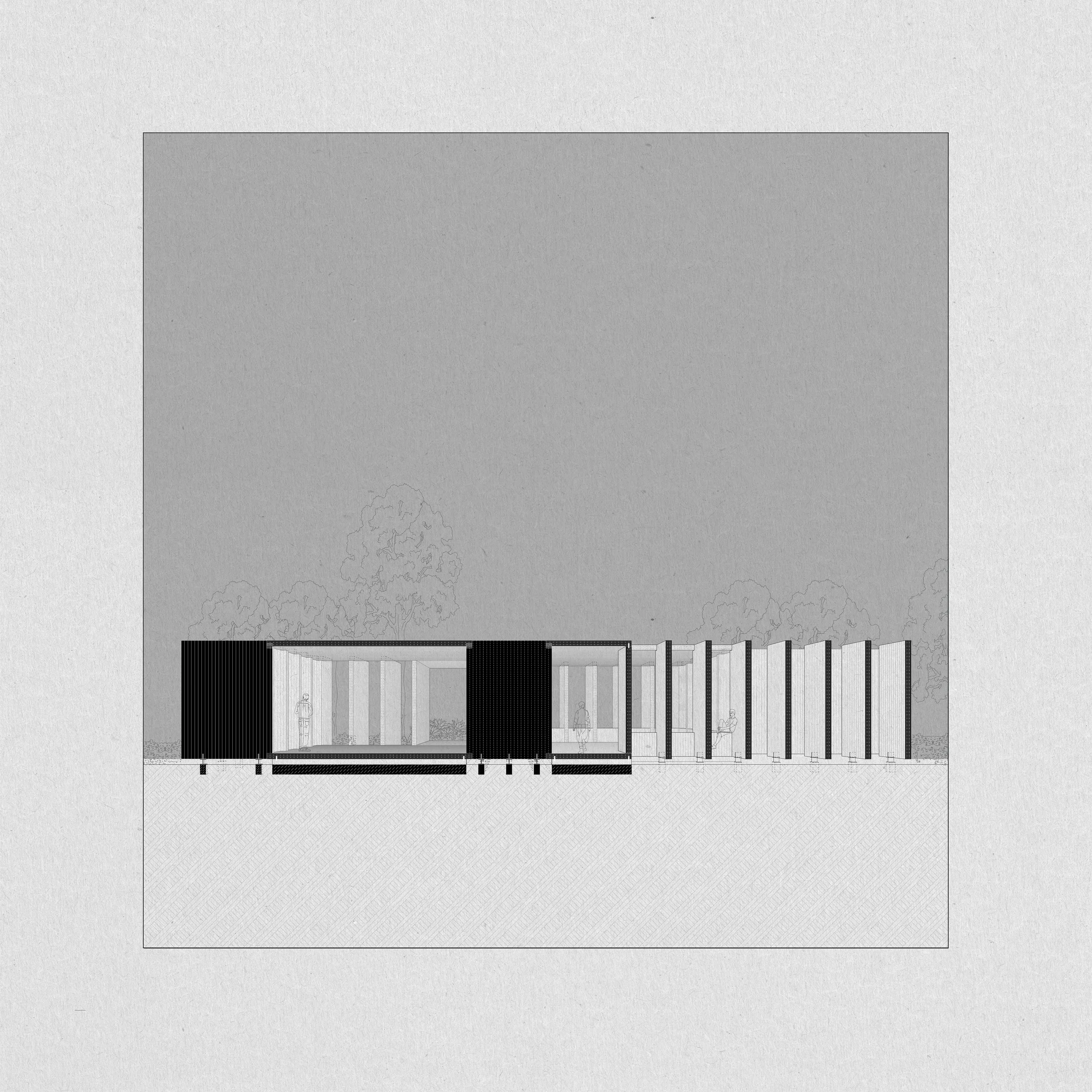 Orientation shapes the space. Openings frame views, while solar exposure defines use - shaded, enclosed areas to the south and more open, light-filled rooms to the north (see wall arrangement).