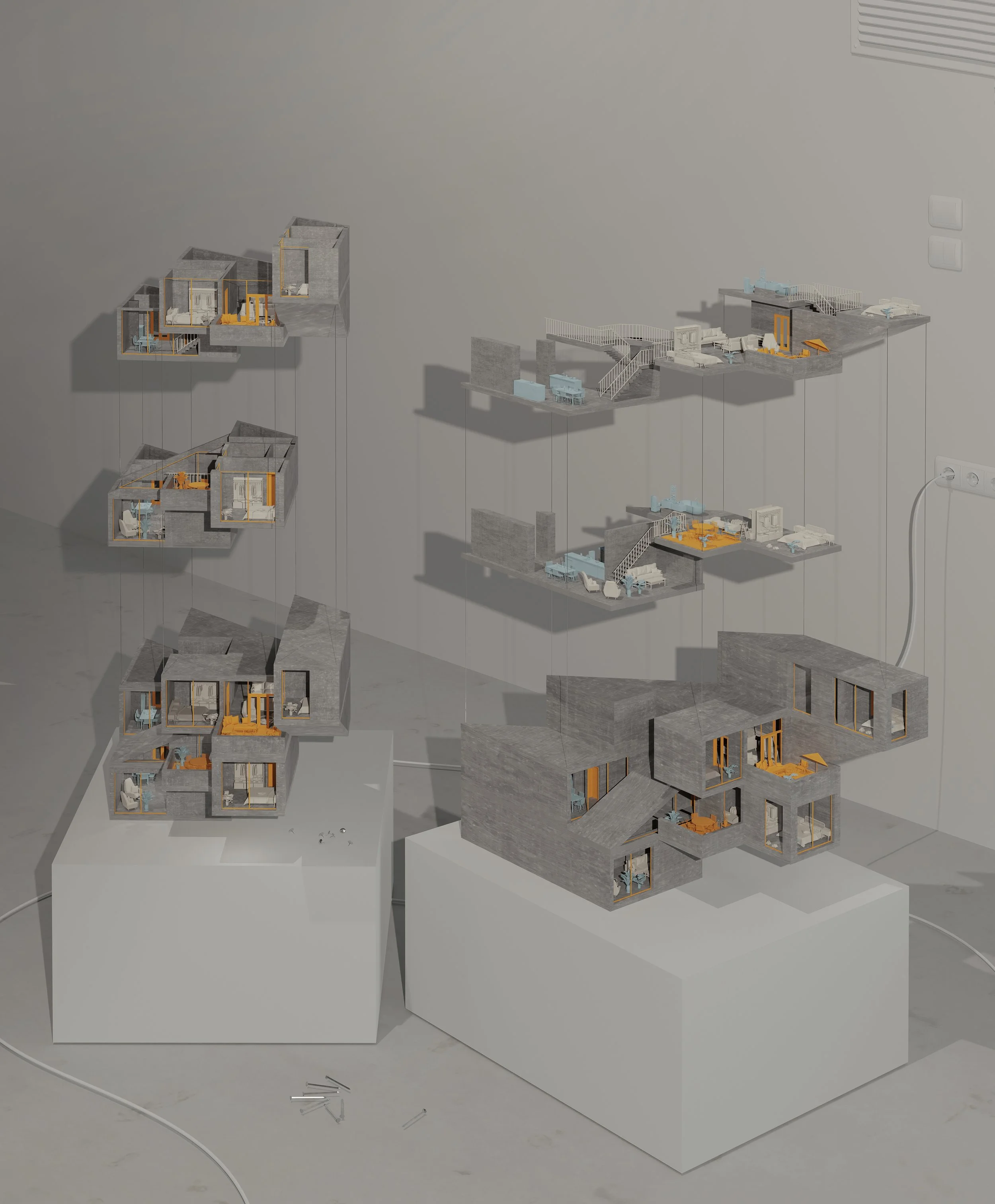 Outdoor space is introduced through a system of voids, forming a second key component of the design. Each apartment is extended with a private terrace, embedding domestic outdoor space within the vertical structure.