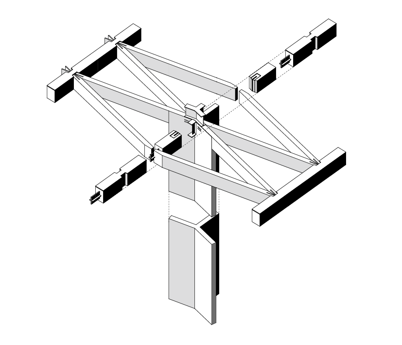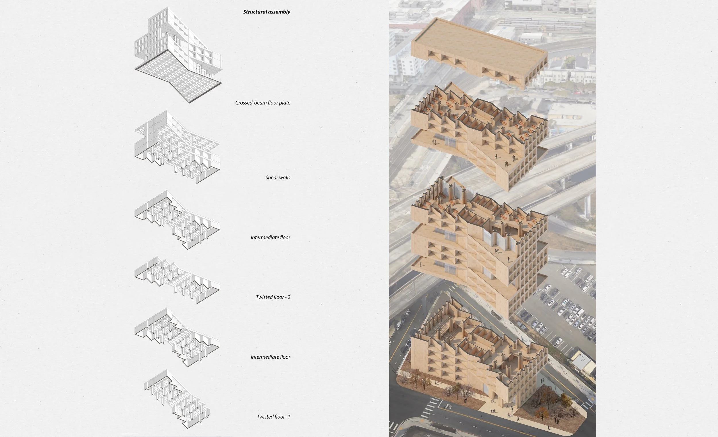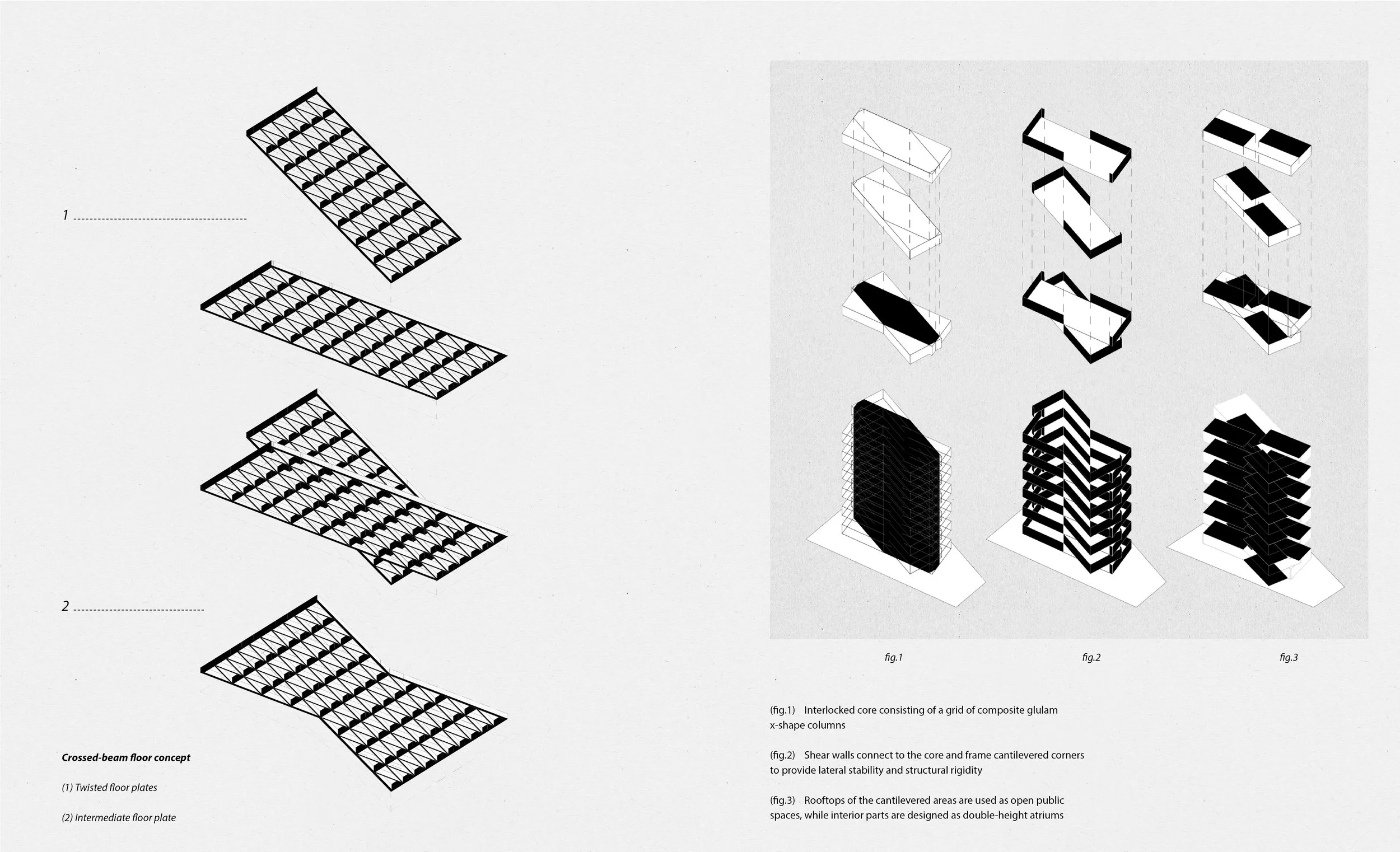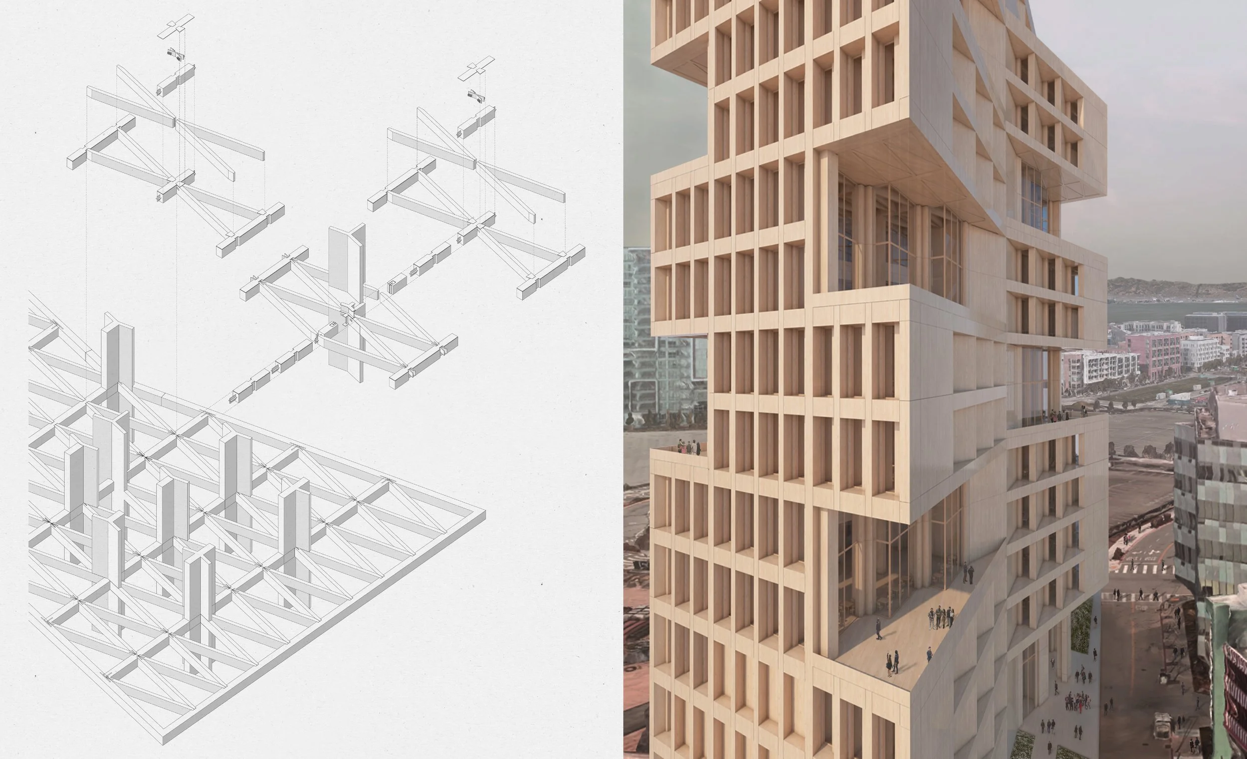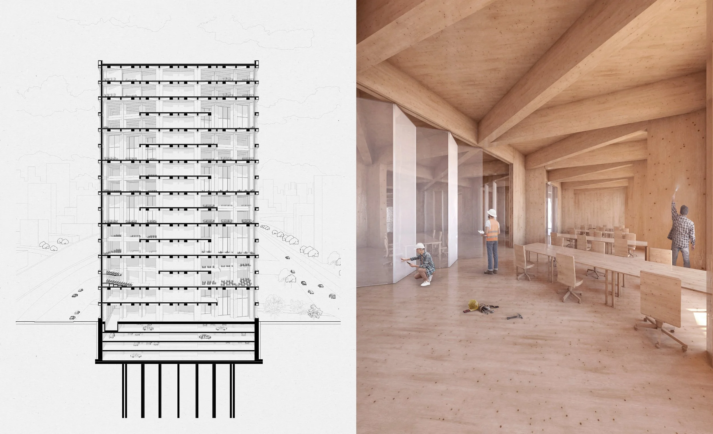 45 × 110 cm girders transfer loads to a series of 30 cm-wide beams, forming Interlocked Floor System. At the perimeter, spandrel beams tie the system together, contributing to overall stability and seismic performance. Loads are then transferred to Glulam X-shaped columns, that form Interlocked Core System, spanning up to 9 meters, accommodating a range of programmatic configurations within the building.