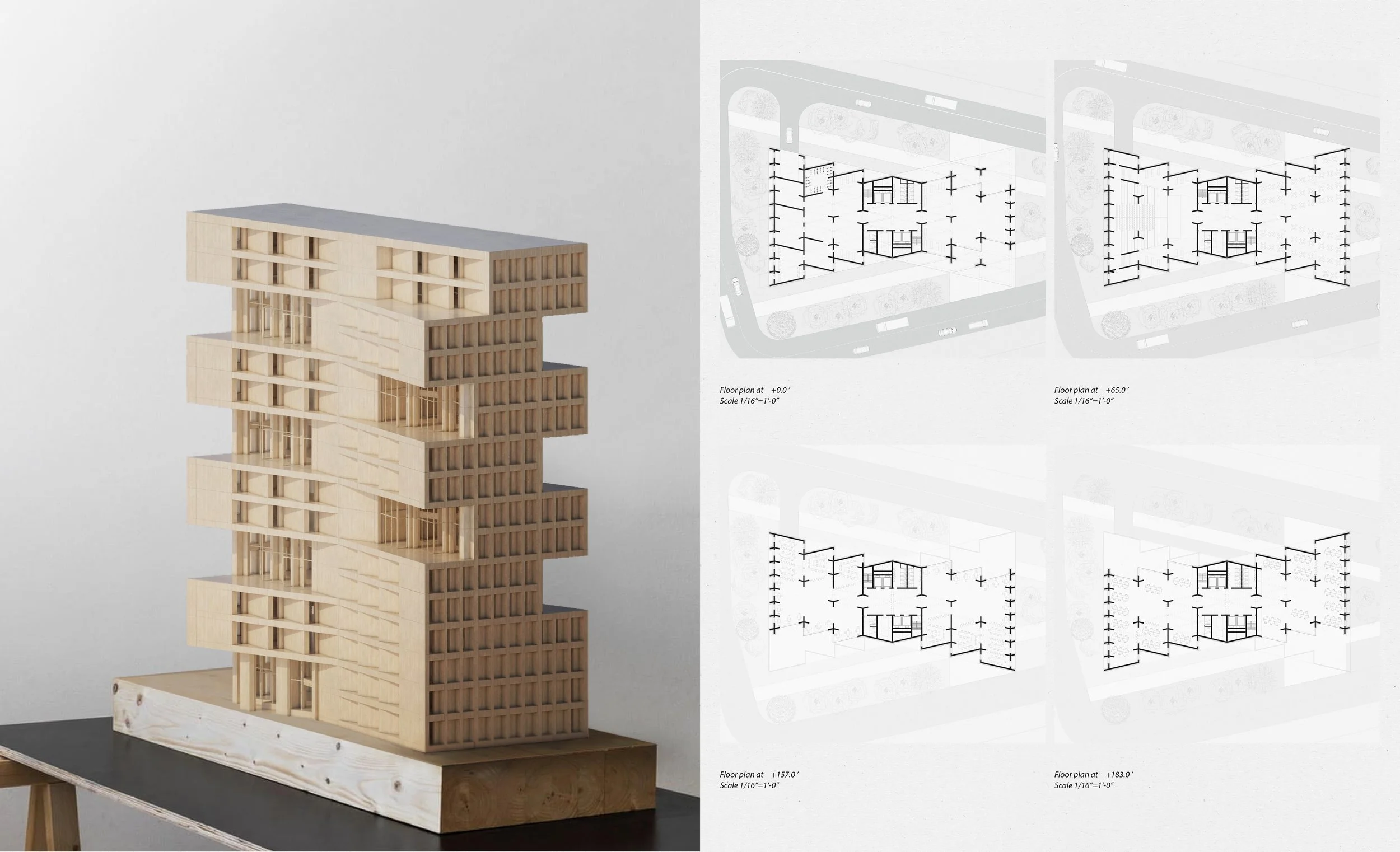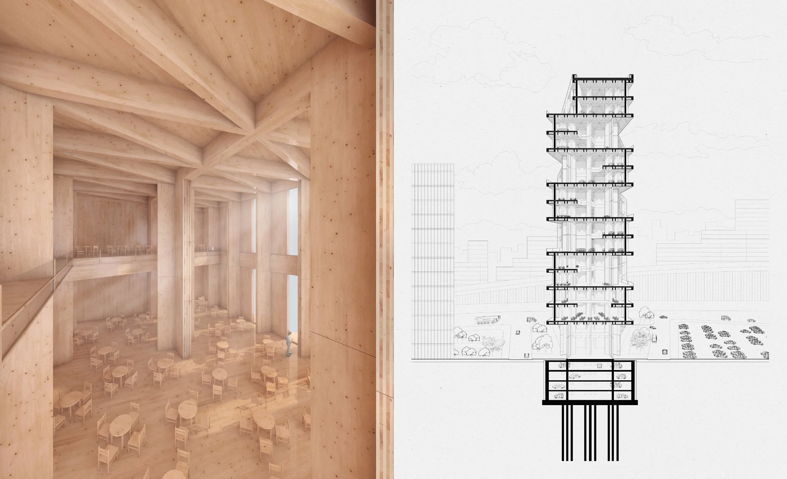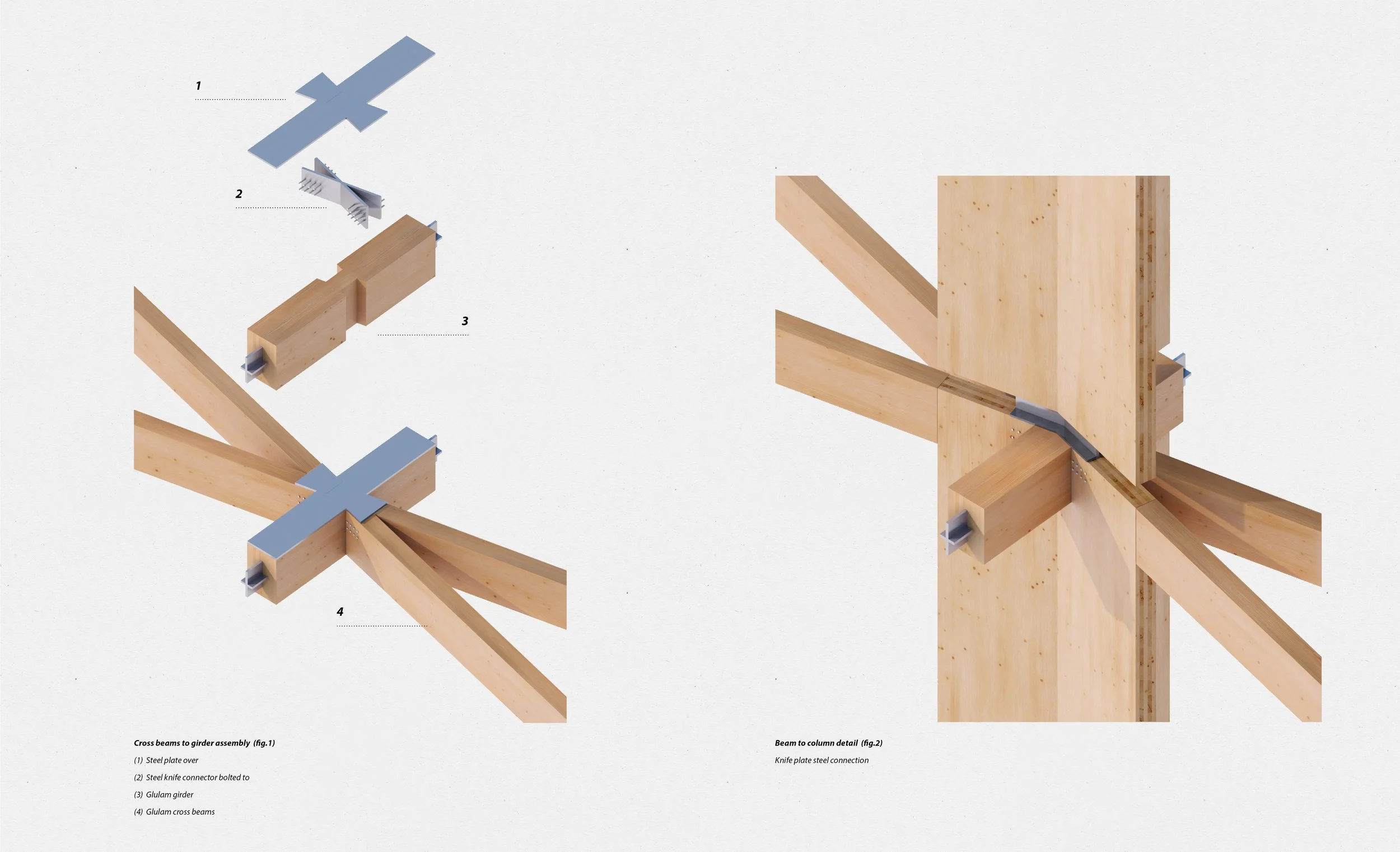 Building on timber’s natural capacity to efficiently transfer loads, this project of Life Sciences Research Center extends the investigation through mass timber systems - by leveraging engineered wood, CLT and Glulam, it enhances structural performance. The building form is driven by structural logic, expressed through the joints and connections of 2 primary systems: horizontal load-bearing members—glulam girders, beams,spandrels, and CLT floor plates—and vertical load-bearing elements— Glulam X-shaped columns.